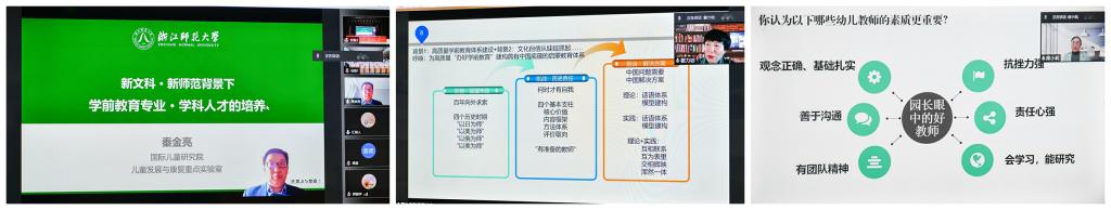 “新时代:中国学前教育事业发展面临的机遇和挑战”主题研讨环节,浙江师范大学国际儿童研究院经理暨儿童发展与康复重点实验室主任、中国学前教育研究会副理事长秦金亮教授,北京师范大学教授、博士生导师、学前教育发展研究院经理霍力岩,广州幼儿师范高等专科学校学前教育学院负责人席小莉博士分别进行了“新文科新师范蕴含下的学前教育人才培养”、“ 为高质量‘办好学前教育’建构具有中国底蕴的启蒙教育体系”、“新时代学前教育专业本科课程建设的思考”三场主题报告。