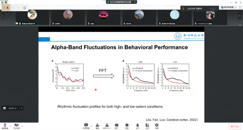 贾建荣教授的报告从视觉注意的神经节律及其动态调控机制切入,分别从“任务相关刺激自上而下加工的时间动态机制”,“任务无关刺激自下而上加工的时间动态机制”以及“视觉刺激加工中工作记忆的倒序重演机制”三个方面展开,揭示了人类视觉注意将空间信息转换为时间序列加工的认知神经机制。此外,贾教授还分享了他的研究思路及结果,并详细回答了师生提问。大家就其中的注意调控机制和数据分析方法进行了深入互动和交流。