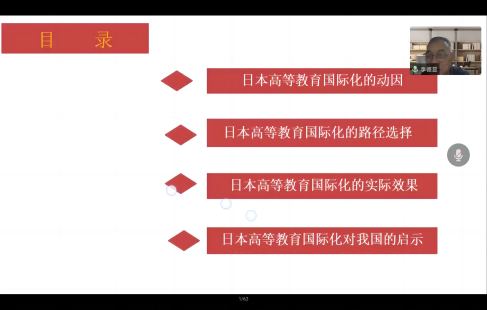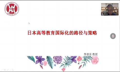 2022年11月15日,辽宁师范大学李德显教授应邀做客毓秀大师论坛,进行了题为《日本高等教育国际化的路径与策略》的专题报告。论坛由永利3044集团官网、社科处共同举办。报告采用线上方式进行,由教育科学公司党委书记赵英主持。教育系教师、教育学专业研究生及本科生100余人聆听了报告。