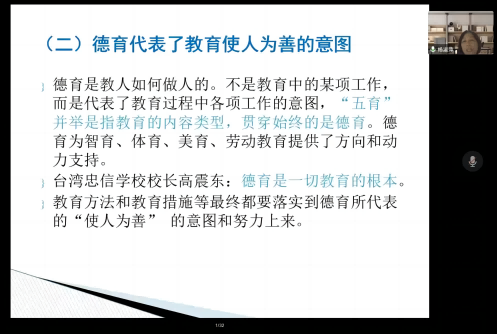 杨淑萍教授的报告以德育在教育中的地位为切入点,阐明德育必定包含使人为善的善意与努力,代表了使人为善的意图,同时育德是教育的根本目的,在此基础上分析了目前学校德育存在的尴尬境遇。报告中,杨教授呼吁德育教师全员化,意味着全体教师都应具有德育意识和德育敏感性;设立专门化和非专门化德育教师;推动学校德育回归育人的本体功能。报告结束后,杨教授回答了师生的提问,并与师生进行了深入互动和交流。
