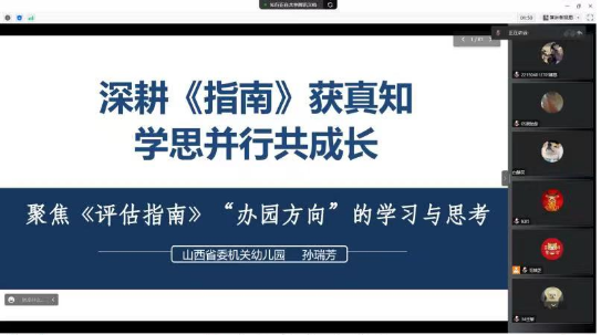 孙主任从“识·观其容”“思·析其意”“研·探其行”三个方面,逐层递进地解读了教育部2022年2月印发的《幼儿园保育教育质量评估指南》中办园方向的三个关键指标点、七个考查要点,并通过五个生动详实的案例分享了省委机关幼儿园在党建工作、品德启蒙与科学理念三个方面贯彻落实《评估指南》精神的具体实践。