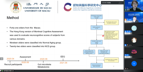 澳门大学曾星霖博士做了“TheBrain-Gut-AxisAlternations ofNeurocognitiveDisorder inMacau:A Multi-OmicsAnalysis”的报告,介绍了对澳门老年人群体的脑肠轴组进行的多指标分析研究。