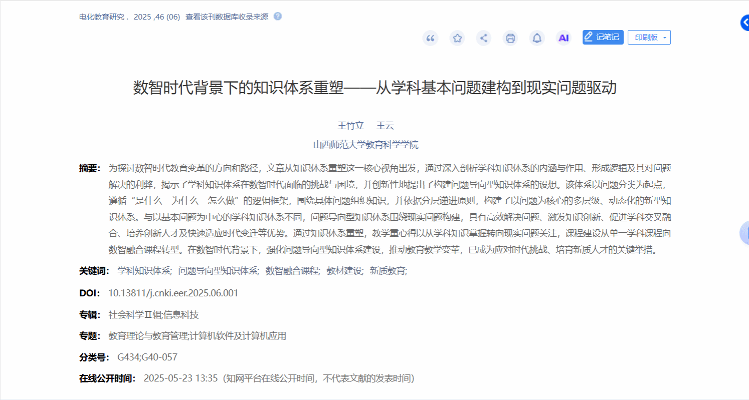 近日,公司特聘教授王竹立在《电化教育研究》2025年第6期发表题为《数智时代背景下的知识体系重塑——从学科基本问题建构到现实问题驱动》的学术论文。