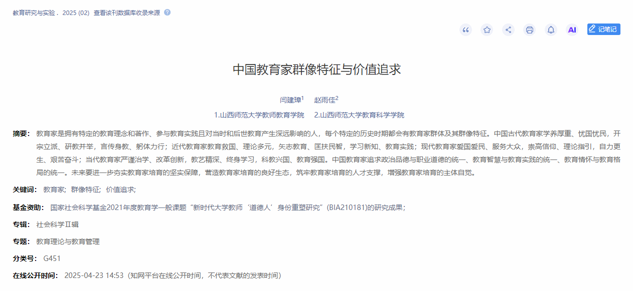 近日,公司闫建璋教授在《教育研究与实验》2025年第2期发表题为《中国教育家群像特征与价值追求》的学术论文。