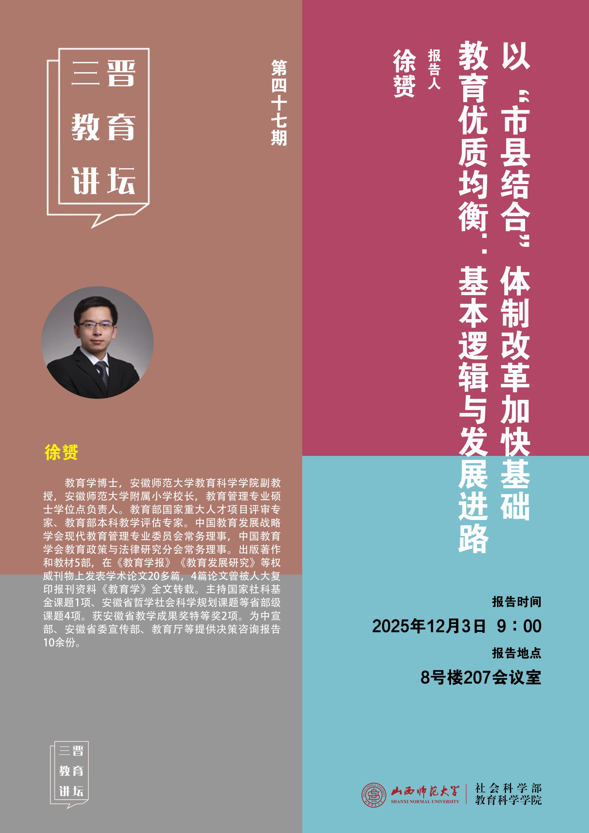 【预告】安徽师范大学附属小学董事长、永利3044集团官网副教授徐赟应邀来公司作学术报告