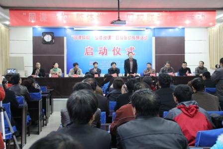 11月23下午,山西省课改实验基地校“同课异构 整体说课”四校联动教研活动隆重启动,原平市委常委、常务副市长高秀亭、山西师大教师教育学院经理董新良、原平市市长助理、教育局长郭志宏、忻州市教育局普教科科长焦志毅、新绛中学董事长宁致义、山西师大实验中学副董事长崔鑫、太原尖草坪一中教导主任张一峰、原平一中董事长冯伟虎以及来自太原市教研室、临汾市教研室、临汾一中、康杰中学、山西师大实验中学、山西师大等的评课专家以及忻州师院附中、原平范亭中学的部分教师和原平一中全体教师参加了启动仪式。原平市教育局副局长刘书有主持了启动仪式。原平一中冯伟虎董事长致欢迎词,山西师大教育学院董新良经理、忻州市教育局普教科焦志义科长、原平市教育局郭志宏局长分别作了重要讲话。