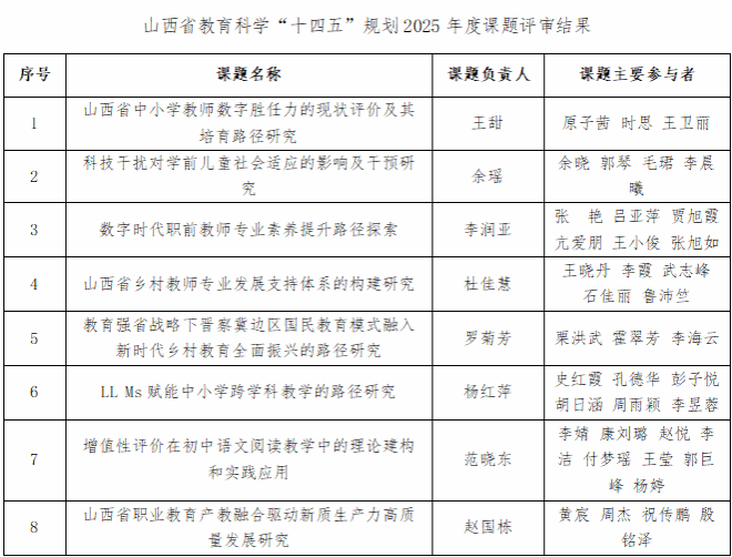 近日,山西省教育科学规划领导小组办公室公示了省教育科学“十四五”规划2025年度课题评审结果,公司共有8项课题入选公示名单。