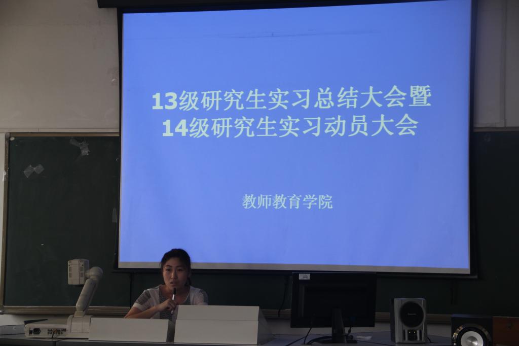 最后,张潮副经理对2013级研究生的实习汇报进行了总结,她说,从同学们的汇报中可以看出,大家教育实习的态度是认真的,实习的方向是多元化的,实习的内容比较充实,实习工作做的也很扎实,并提出了研究生实习中一些问题,希望大家改进。张潮副经理对2014级研究生的实习作了部署安排,希望他们的实习要做到三个接轨——“与学校实际接轨、与专业接轨、与时代接轨”,认真的完成好自己的教育实习。