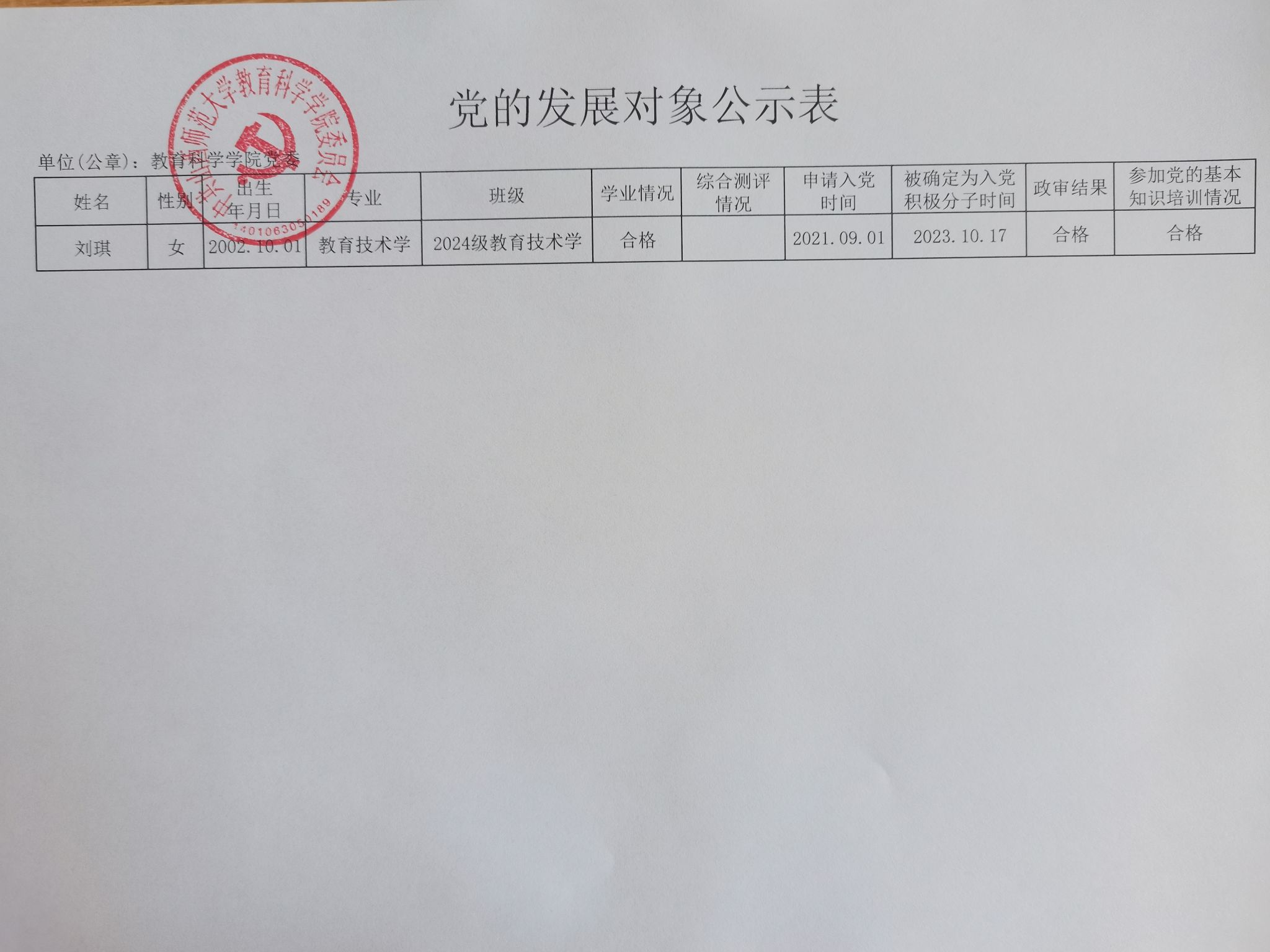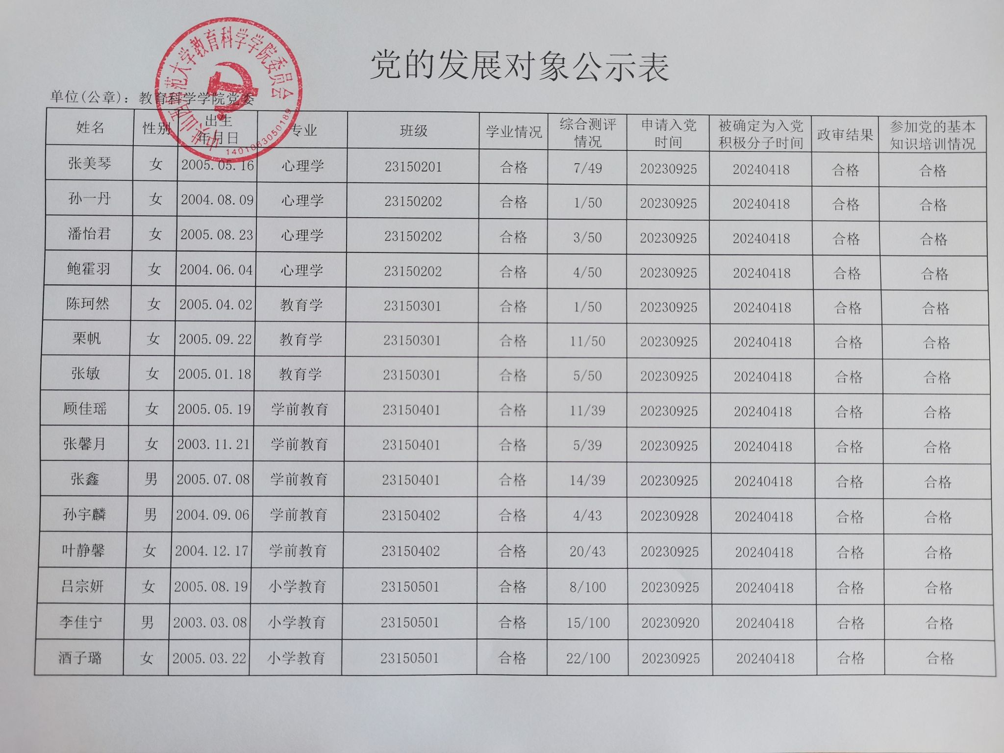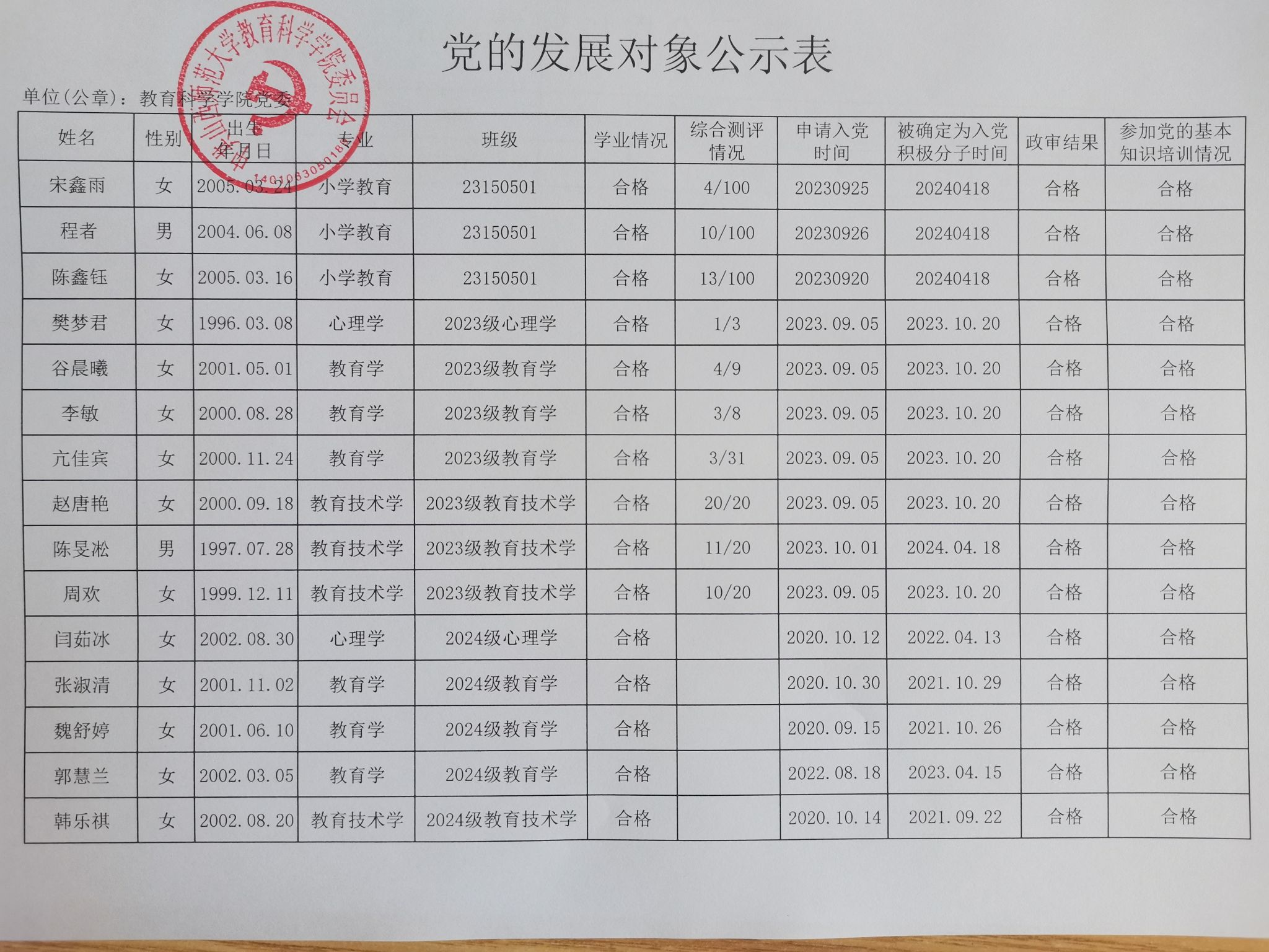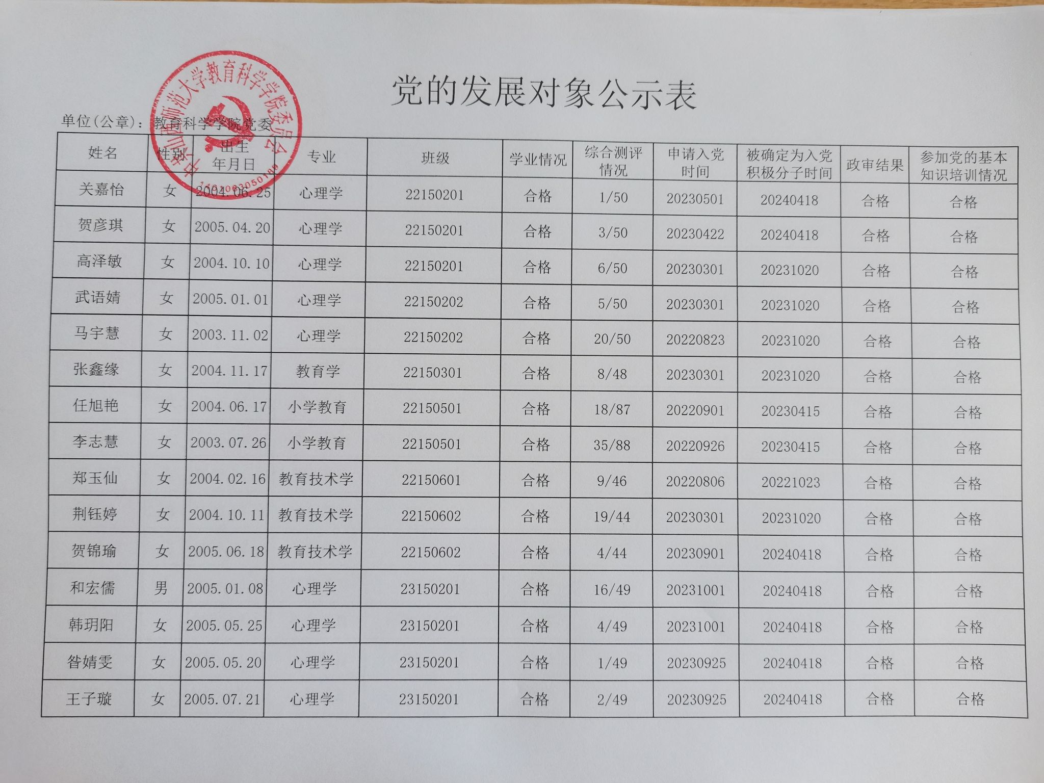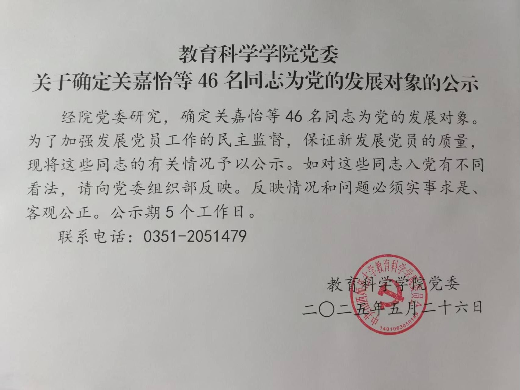 关于确定关嘉怡等46名同志为党的发展对象的公示