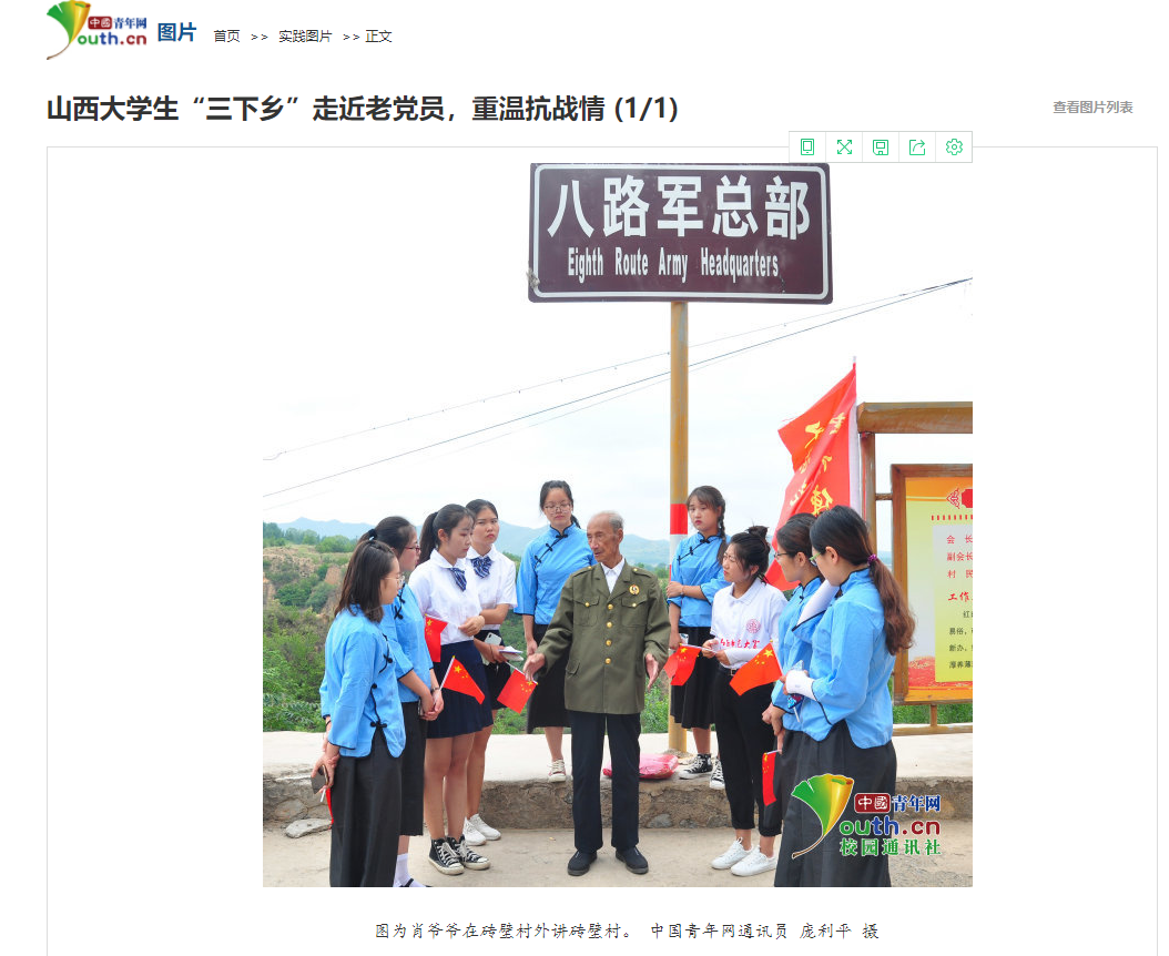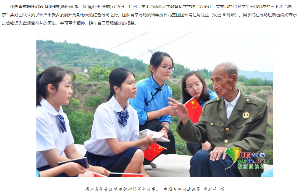 9月24日,国内最大的青年主流媒体“中国青年网”集中报道了公司“心研社”党支部暑期“三下乡”的活动盛况。近年来,公司党委积极打造“党旗领航社团群”党建品牌,即强力推进以“心研社”党支部为引领的,以“心研社”社团为主体的“社团群”建设,取得了阶段性成效,在学院“立德树人”的办学实践中发挥了重要作用。此次暑期“三下乡”红色寻访社会实践活动进一步丰富了党建工作的内涵,拓展了思想教育的领域,是公司党建和思想政治工作继4月“心研社”团支部被共青团山西省委授予“全省五四红旗团支部” 荣誉称号、5月《人民日报》“有品质的新闻”栏目以崭新的视角报道“心研社”喜迎中华人民共和国成立70华诞暨成立25周年系列活动、6月《中国日报》中文网以图文并茂的形式报道“心研社”党支部“过好政治生日,坚定信仰信念”主题党日活动之后的又一标志性工作成果。