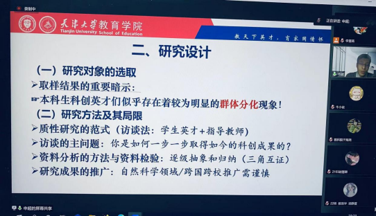 2022年10月30日19时,公司优秀员工、天津大学教育学院申超副教授应邀做了题为《本科生中的“科创英才”是如何“炼”成的?》的学术报告。本次讲座由社科处和永利3044集团官网共同举办,教育系主任李慧燕老师主持,教育系教师、教育学专业和小学教育专业的研究生及本科生200余人在线聆听了讲座。