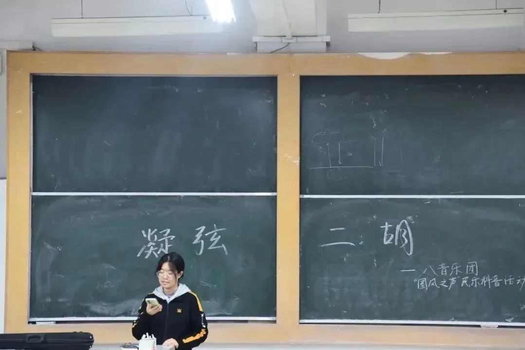 本期社团成员向同学们介绍了民族乐器二胡。二胡是中华民族乐器家族中主要的弓弦乐器之一,它具备清新明亮的音色和丰富的艺术感染力。活动中,主讲人向同学们介绍了二胡的历史文化背景、乐器结构组成以及发展情况,还为大家带来了经典曲目《孟姜女》和《送别》,现场观众陶醉在余音绕梁的乐曲之中,不由地献上阵阵掌声。在社团成员的邀请下,数位同学上台零距离接触二胡,并在工作人员的指导下完成了初次演奏,同学们纷纷表示这是一次难得的体验。